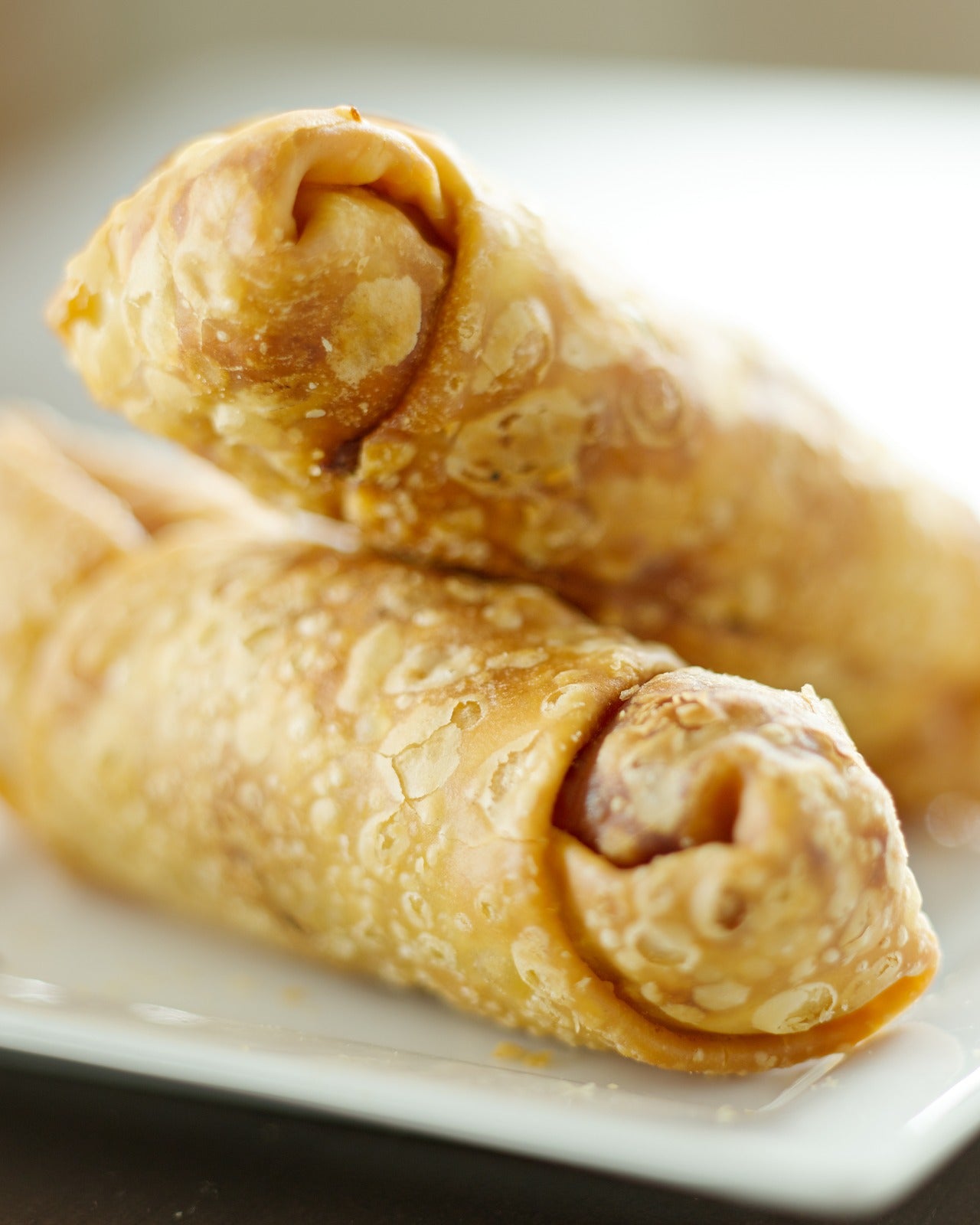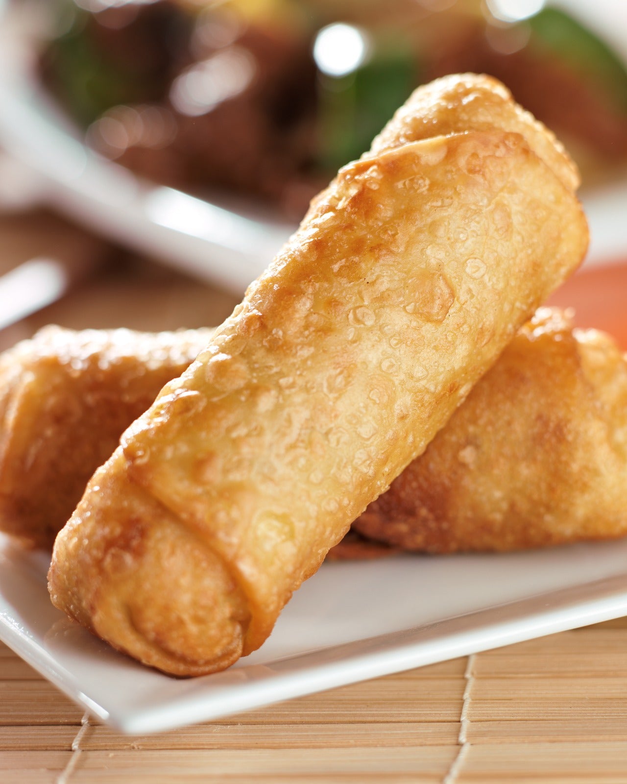Heat oil in a deep pan or pot to 350°F. Add enough oil to submerge the egg rolls fully.